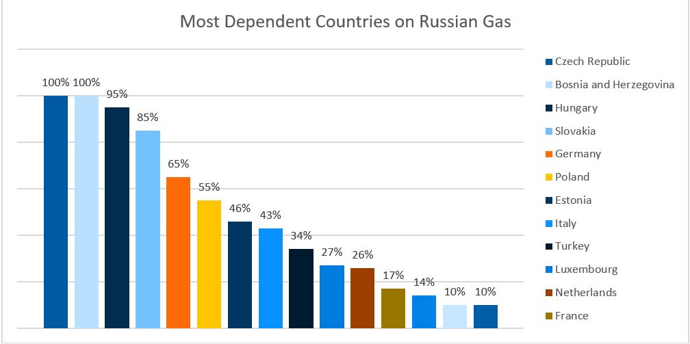W marcu 2022 roku 85% zapotrzebowania UE na gaz pochodziło z importu. W tym 34% z Rosji, a tylko 17% z Norwegii. Zależność od rosyjskiego gazu w UE znacznie wzrosła, a jak pokazuje poniższy wykres niektóre kraje są całkowicie zależne od tego jednego źródła.