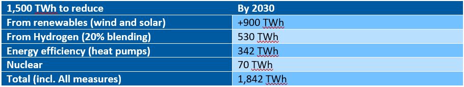 - Maksymalizacja produkcji z istniejących źródeł niskoemisyjnych, takich jak bioenergia i energia jądrowa (może przynieść 70 TWh, zmniejszając zużycie gazu w elektryczności o 13 mld m3).